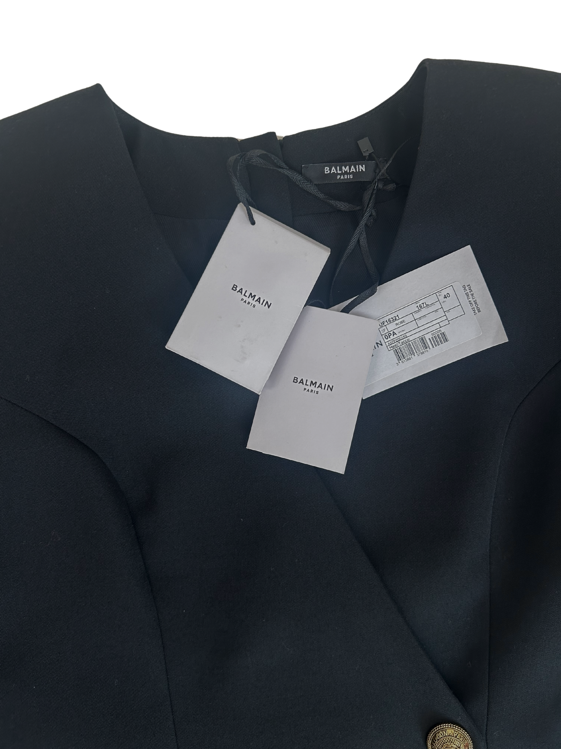 Elevate your wardrobe with this iconic Balmain Paris black blazer mini dress, featuring sharp shoulders, a flattering tailored fit, and signature gold engraved logo buttons. Crafted in premium wool, this dress exemplifies Balmain's updated take on a classic silhouette with an asymmetric faux-wrap front and strong structured shoulders. Sleek gold back zipper and long sleeves with back button cuffs. V-neck. Lined. New with tags.