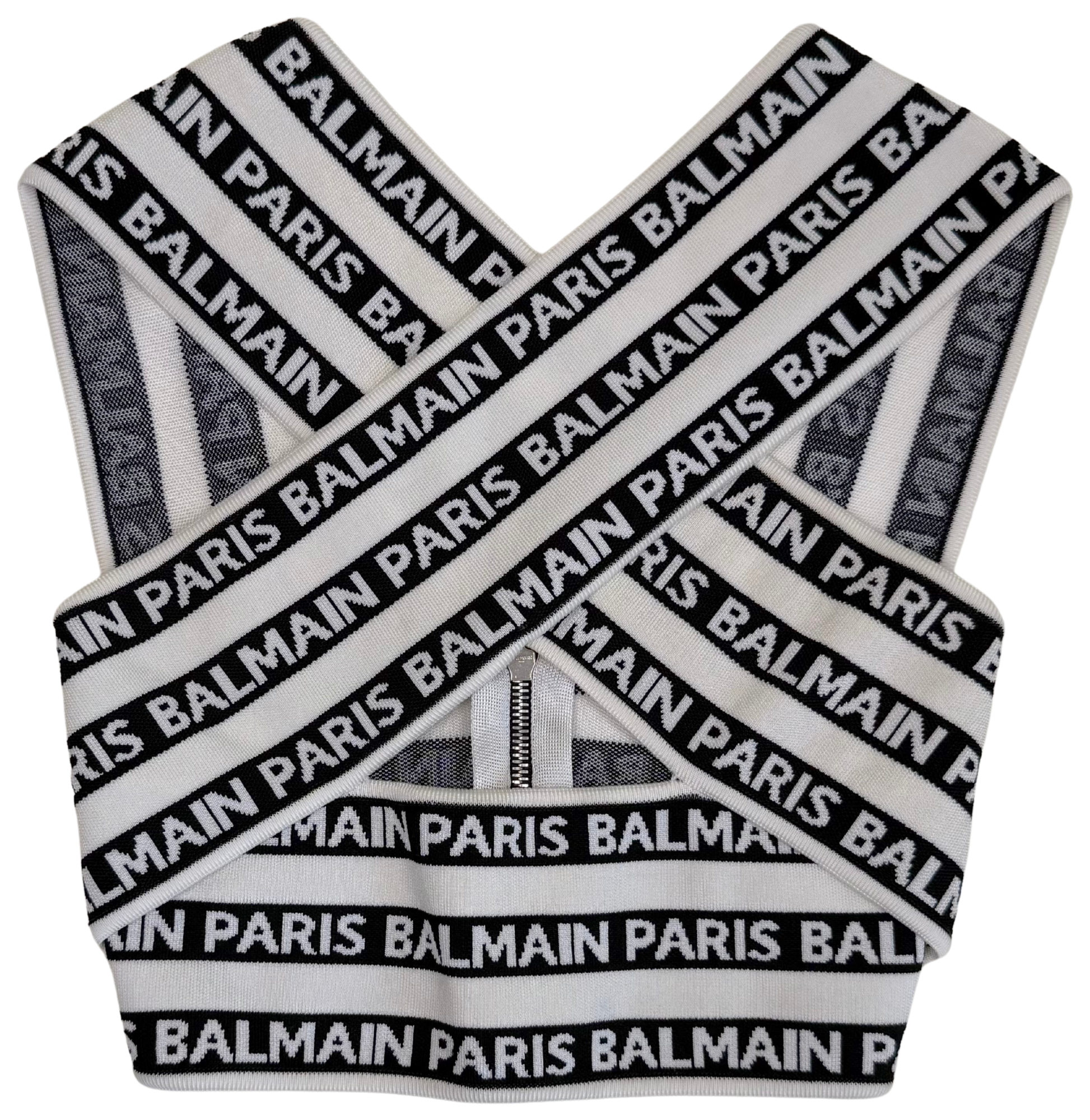 Sleeveless stretch-knit crop top by Balmain, crafted from a luxe viscose-blend fabric. Featuring a striking black and white palette, the top is adorned with the iconic Balmain Paris logo pattern woven throughout. A unique crisscross wrap design creates a cut-out effect at the front, while the open back is finished with a silver-tone zip closure. Detailed with tonal stitching and sculpted to contour the body, this piece blends sporty edge with high-fashion flair.