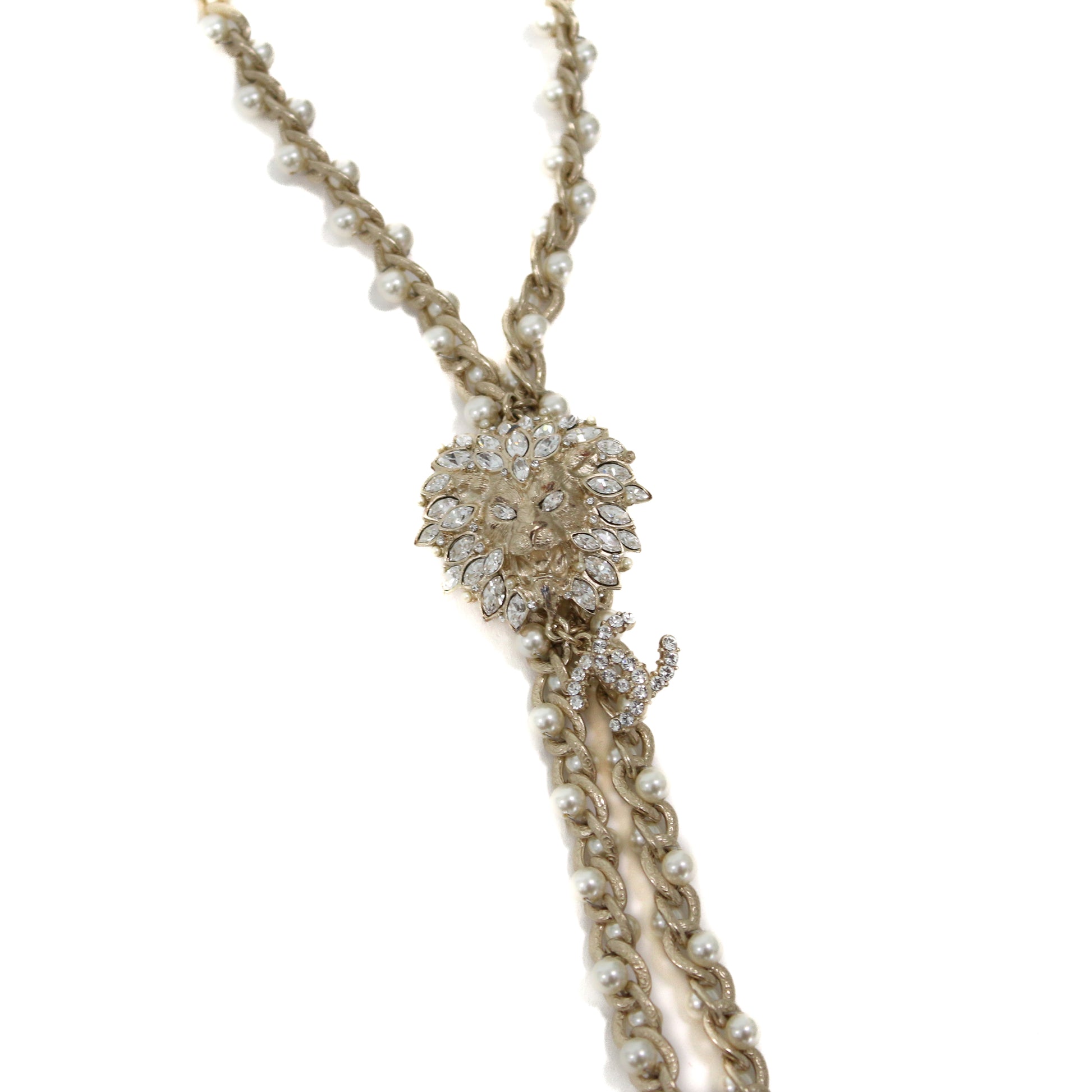 Chanel Bolo-esque necklace In Gold-Tone Metal Chain With Threaded Faux-Pearls; Features Lion's Head Pendant With Inset Rhinestones And Dangling Rhinestone CC Charm. Lobster Clasp At Back From Spring 2011 Collection By Karl Lagerfeld