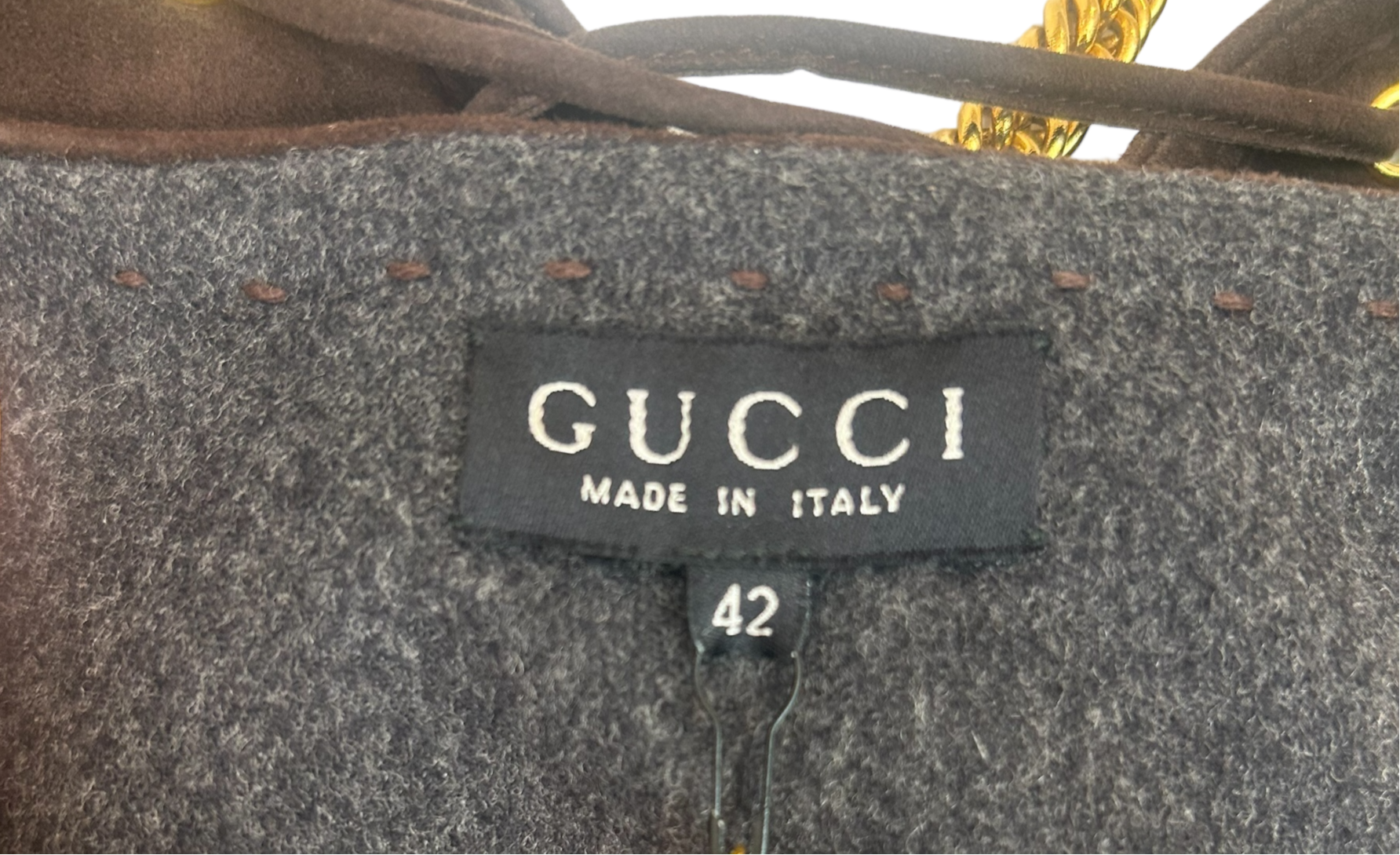 Designed during Gucci’s late-1990s renaissance under Tom Ford, the piece captures the house’s iconic fusion of sensual luxury and 1970s bohemian glamour. It is both highly wearable and highly collectible, made even more significant by its provenance.