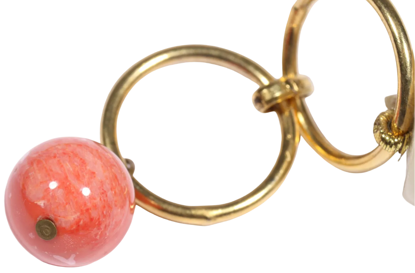 A striking vintage Hassan Bounkit beaded necklace featuring luminous angel skin coral tone beads accented by a bold orange coral center bead and sculptural gold tone spacer elements.