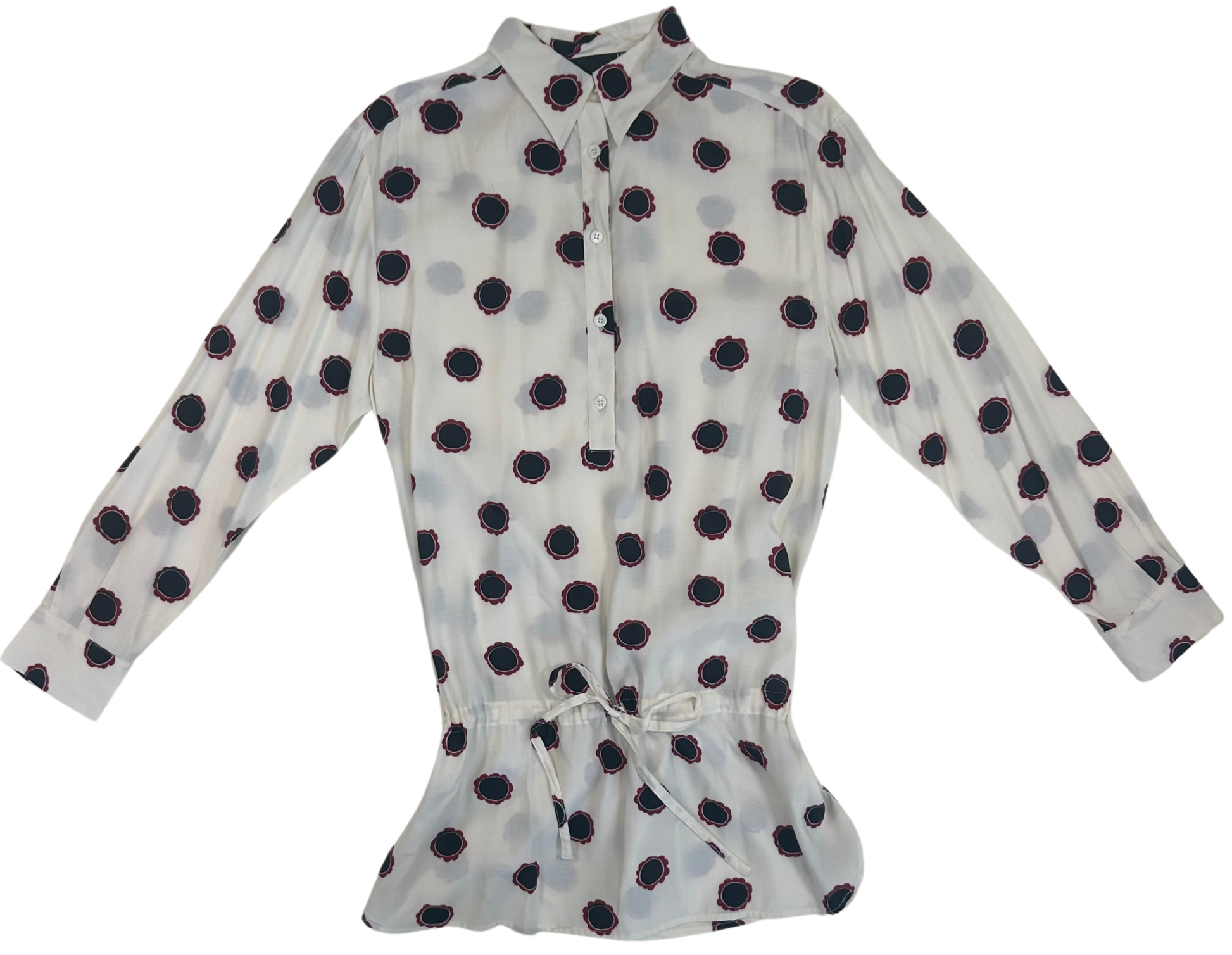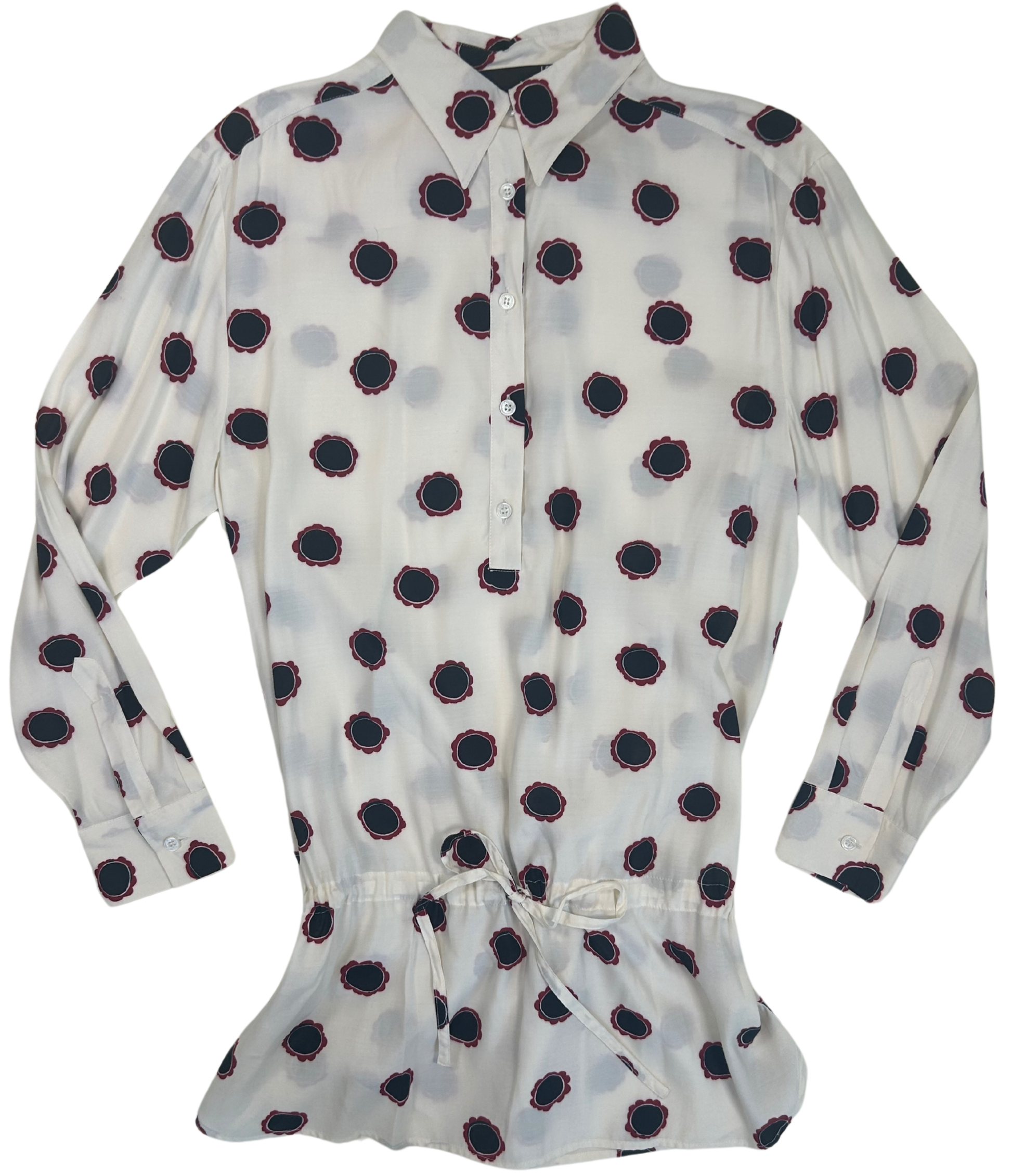 From the personal collection of the legendary Iris Apfel, this whimsical Love Moschino cotton tunic captures the Italian brand’s playful spirit and modernist flair. Crafted in Italy, this long-sleeve popover blouse features a scattered pop-art polka dot print in black and burgundy, evoking Moschino’s irreverent charm. The relaxed silhouette includes a half-button placket, pointed collar, and a drawstring cinch at the waist for customizable shape and flounce.