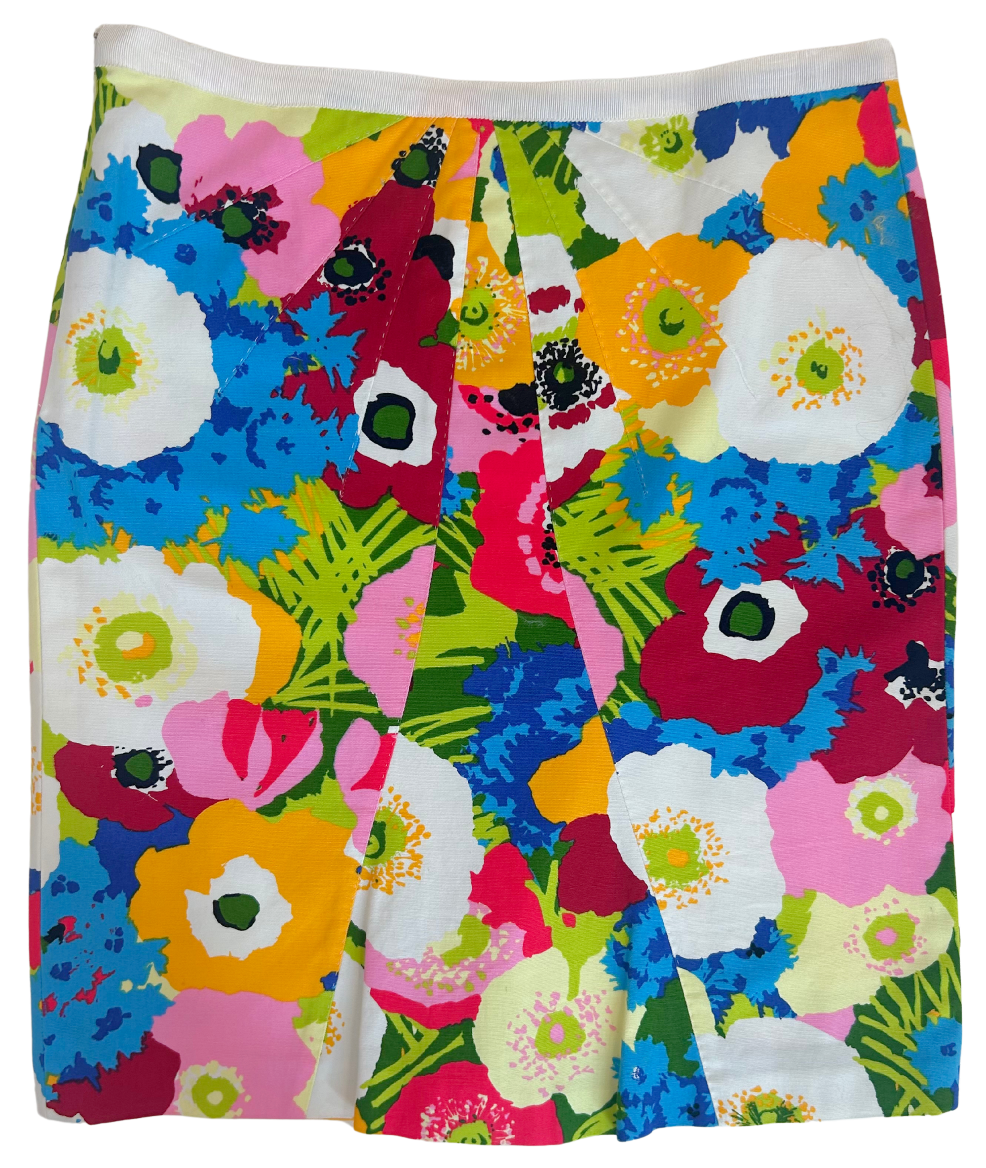 This vibrant vintage Moschino skirt, once part of Iris Apfel’s personal wardrobe, exemplifies the brand’s playful and eclectic aesthetic. Crafted in Italy from crisp cotton, this high-waisted A-line skirt features a clean front and a box-pleated back that adds unexpected volume and movement. Its saturated poppy print in fuchsia, chartreuse, cobalt, and white is pure Moschino—bold, playful, and irreverent. Designed to sit at the natural waist, the skirt flatters the figure with its structured silhouette, while the bold pattern channels 1960s mod energy with a fresh, modern twist.