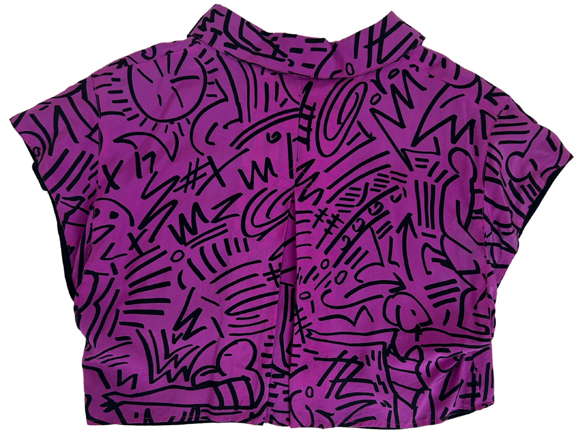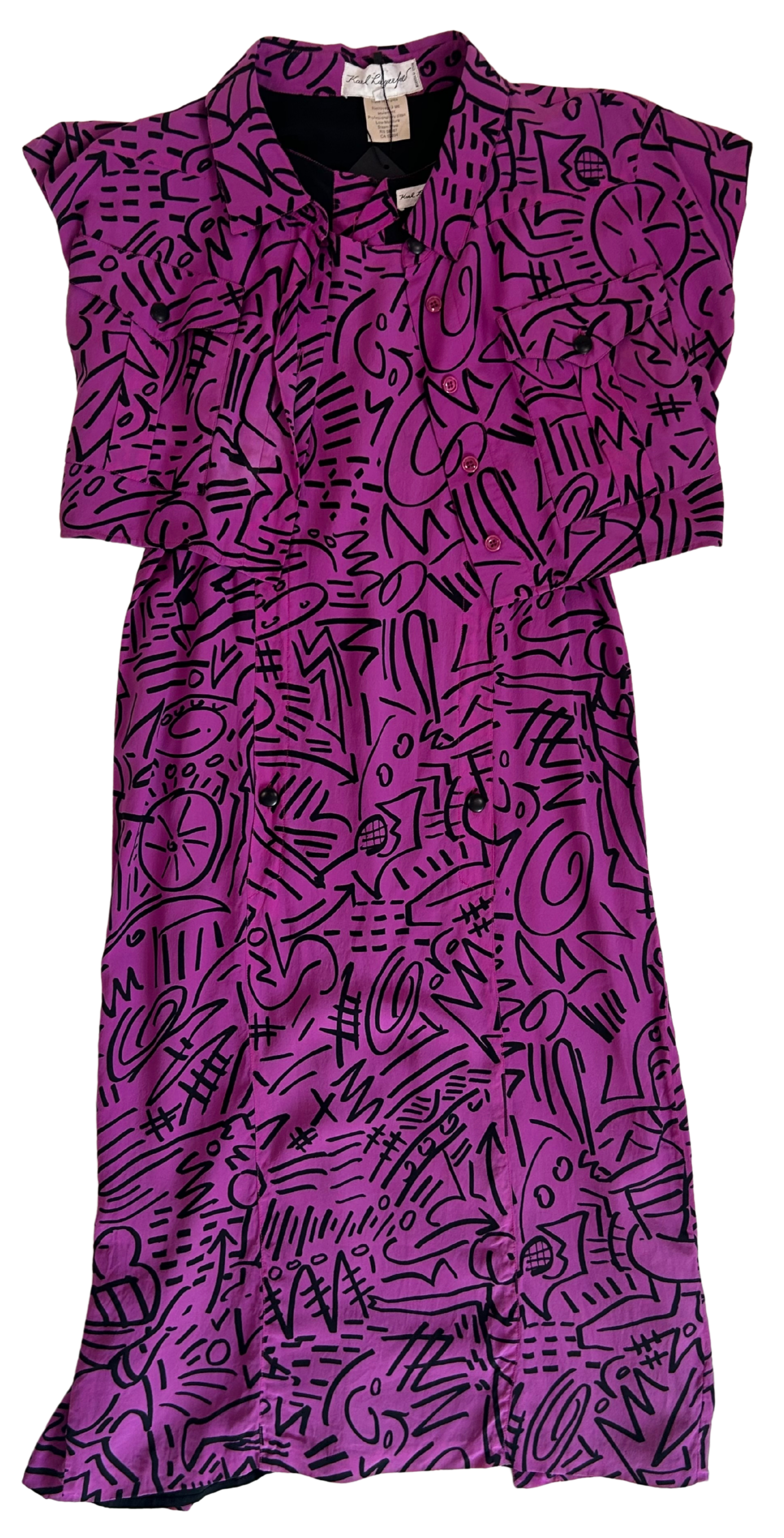 Step into iconic 1980s fashion with this rare vintage Karl Lagerfeld two-piece set, featuring a sleeveless silk midi dress and matching cropped jacket. Crafted in luxurious 100% silk, this designer ensemble showcases an electrifying abstract graphic print in bold purple and black – a signature nod to Lagerfeld’s visionary style.