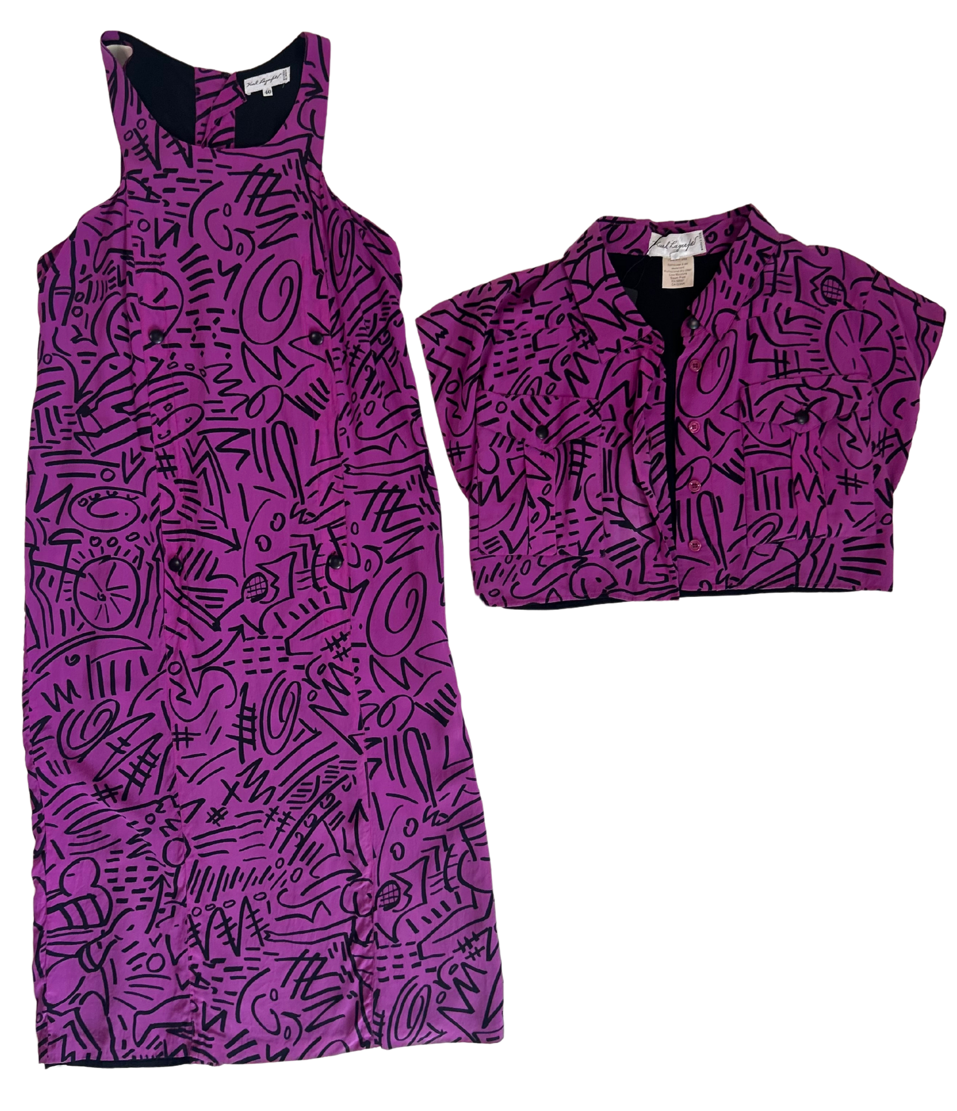 Karl Lagerfeld Vintage 1980's Purple and Black Abstract Print Silk Midi Dress and Cropped Jacket