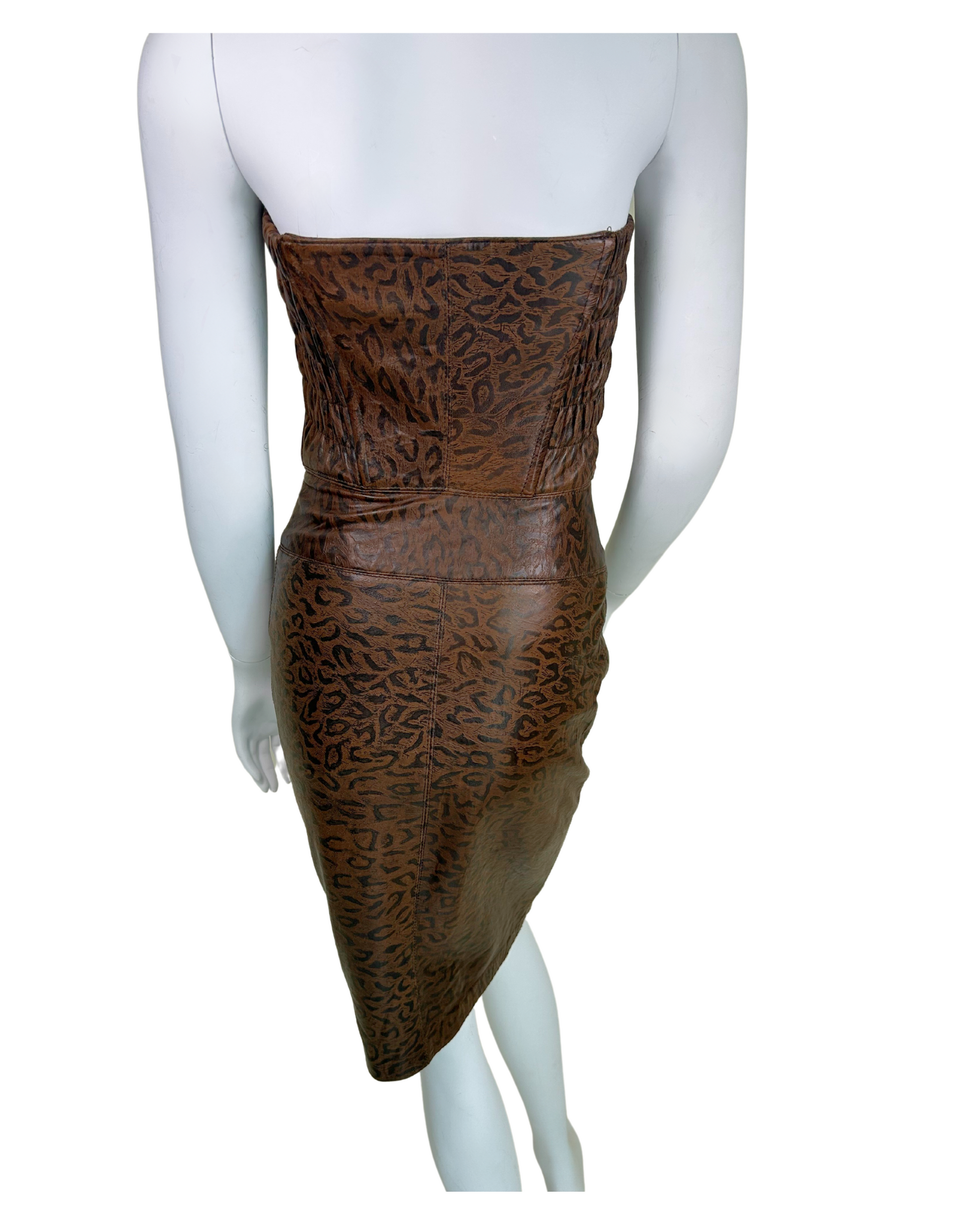 Unleash unapologetic confidence in this vintage Michael Hoban for North Beach Leather bustier dress. Crafted from supple brown leather with an allover abstract animal print, this iconic bodycon silhouette features a structured strapless sweetheart neckline, snap button front, and curve-accentuating seams throughout. Hoban’s signature edge is on full display—sleek, sensual, and made to turn heads.