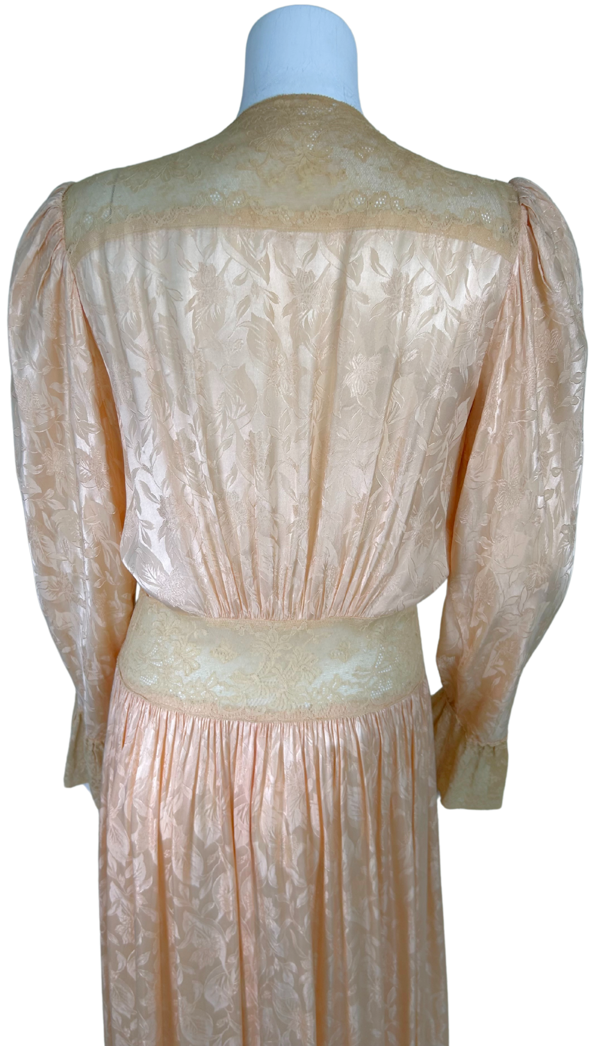 Step into the soft, romantic luxury of the 1930s with this breathtaking vintage blush pink satin and lace peignoir robe. Crafted in a floral jacquard satin with a luminous sheen, this elegant piece features long bishop sleeves with wide flared lace cuffs, a deep plunge neckline trimmed in sheer floral lace, and a gathered full-length skirt for dramatic movement. A defined lace waistband cinches the silhouette and fastens at the front with self-covered satin buttons, a signature detail of 1930s couture-quality loungewear.