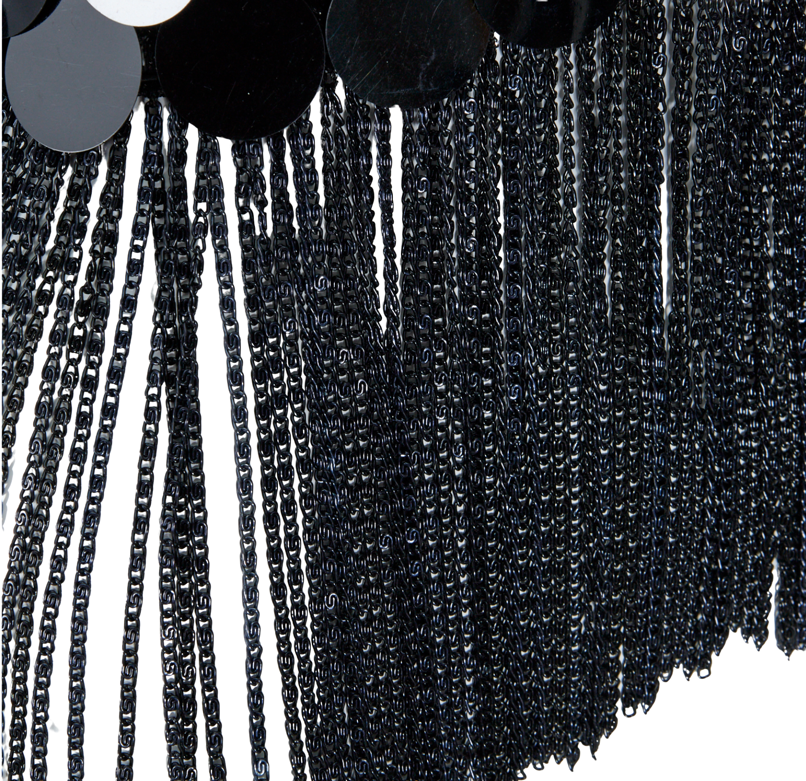 Channel the drama of disco-era glamour with this rare vintage 1970s Loris Azzaro chainmail top. Hand-crocheted in shimmering black metallic thread, this showstopping piece features oversized jet-black paillettes sewn onto a semi-sheer mesh base. The body is adorned with cascading chainmail fringe, offering bold texture and hypnotic movement. Azzaro’s signature sculptural fit and futuristic finish make it a true collector’s piece—perfect for styling over a silk slip dress, high-rise trousers, or layered atop a bralette for a daring evening look.