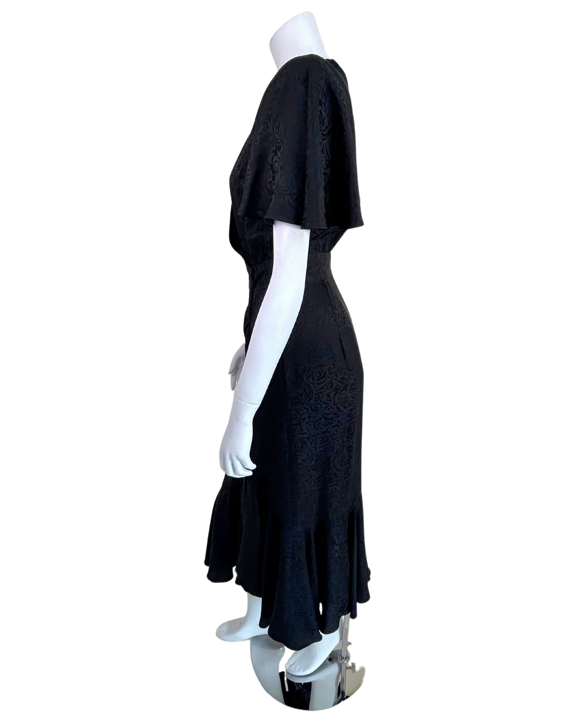 Understated elegance meets vintage romance in this 1990s black silk midi dress by Point of View Collection. Made from 100% silk with a swirling floral jacquard pattern, this piece features a flattering faux-wrap bodice with flutter sleeves, a fitted high waist, and a dramatic draped skirt with a flared hem. Silk-covered buttons trail asymmetrically along the hip for an added touch of vintage charm. The look is timeless, refined, and effortlessly wearable.