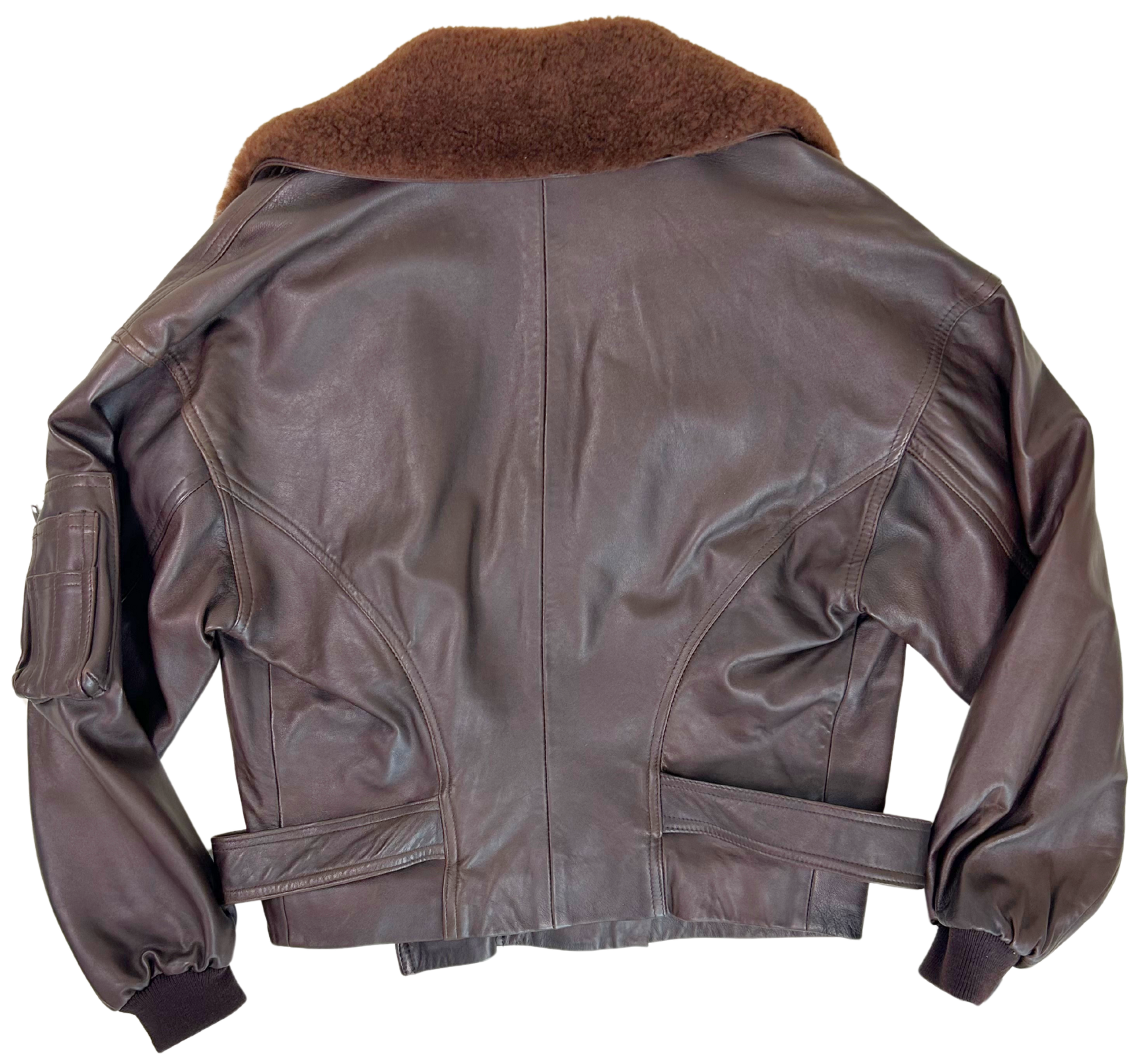 Channel timeless downtown edge with this vintage late 80s, early 90s DKNY leather aviator jacket. Crafted from genuine brown leather with a cozy faux shearling collar, this bold piece captures the era’s iconic oversized silhouette and utilitarian influences. It features a belted waist, ribbed cuffs, grommeted shoulder tabs, and a zippered utility sleeve pocket for added attitude and functionality. Fully lined with a soft acetate blend, it’s finished with classic biker-style asymmetrical zippers and snap epaulets. A standout example of Donna Karan’s New York street-meets-luxury aesthetic.