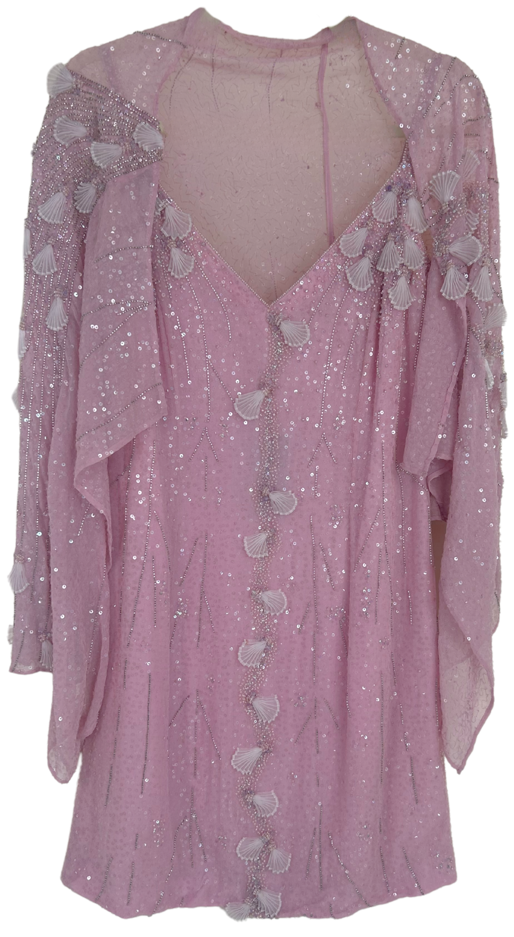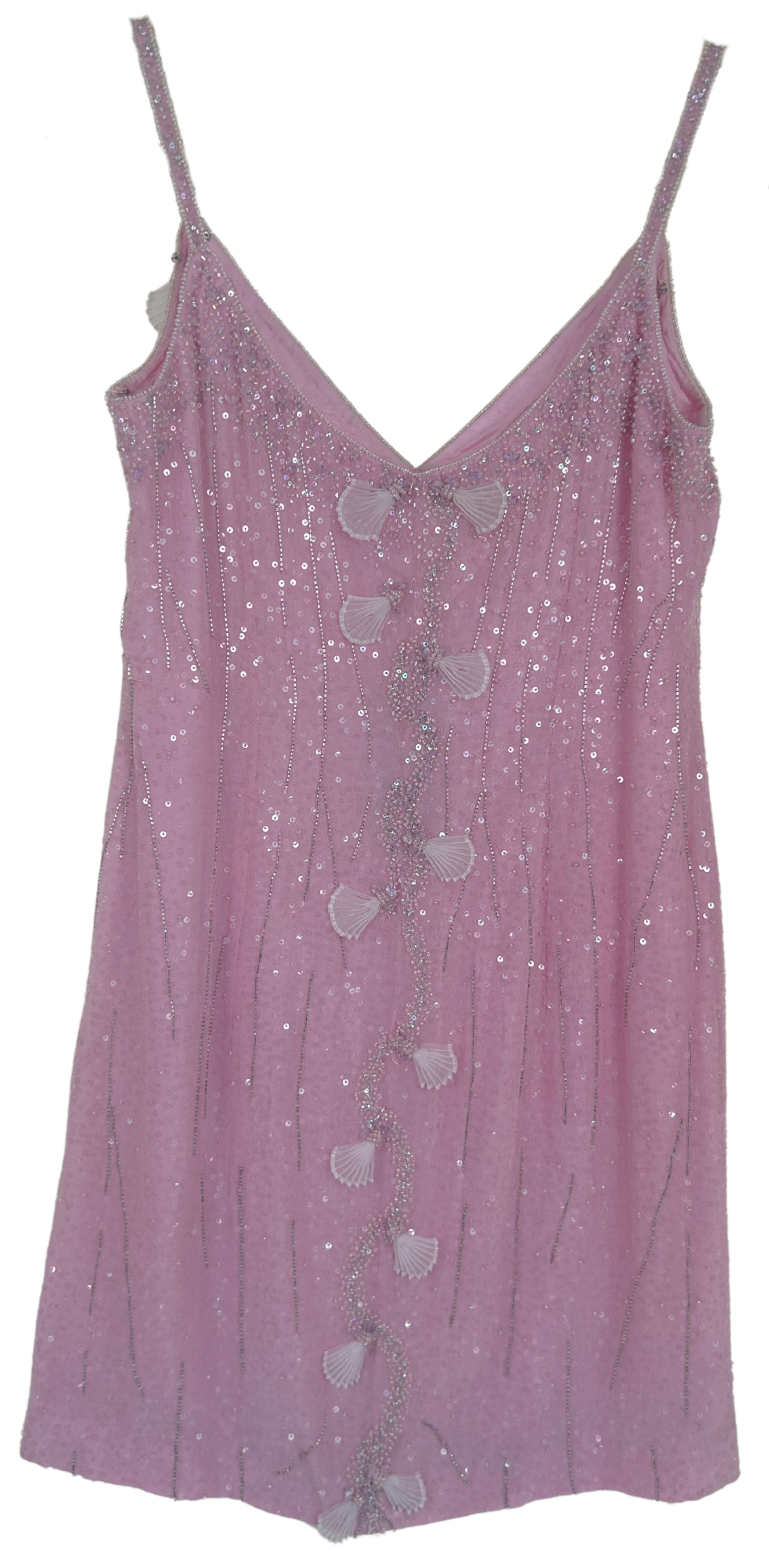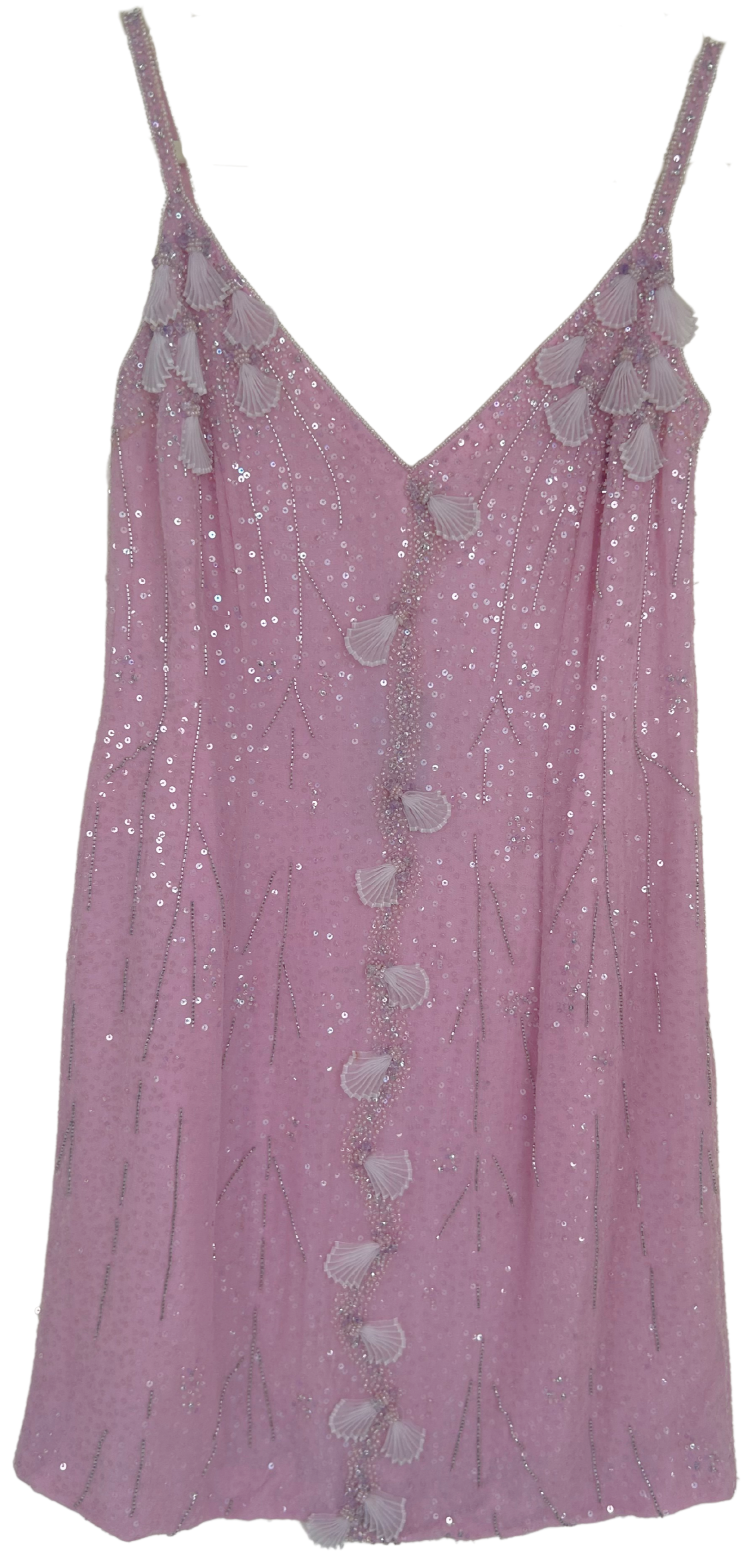 Drenched in dreamy blush pink silk and adorned with shimmering sequins and hand-applied shell-inspired pleated appliqués, this vintage Escada set is pure ‘90s fantasy. The V-neck slip dress features a cascade of delicate beadwork and three-dimensional fan-like embellishments that echo seafoam fronds or deco fringe. A matching sheer shawl, equally encrusted with sequins and accents, completes the look for effortless elegance. Made in India, this piece reflects the high craftsmanship of Escada’s embellished eveningwear of the late 1990s.