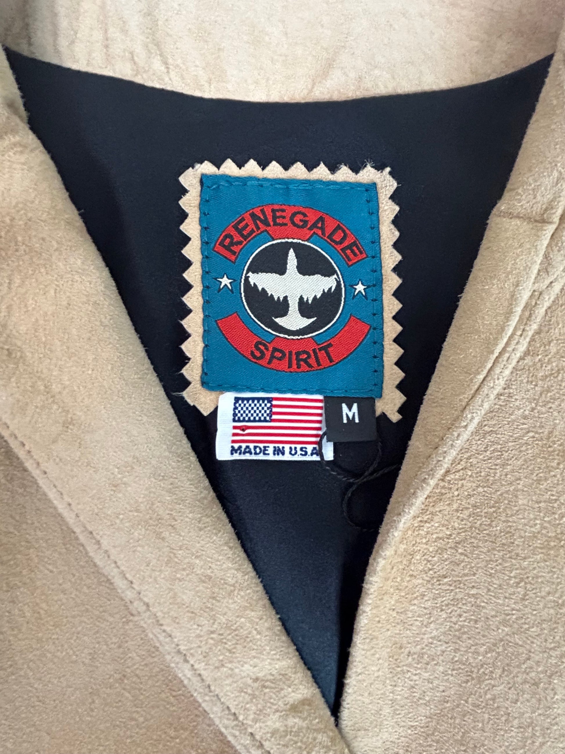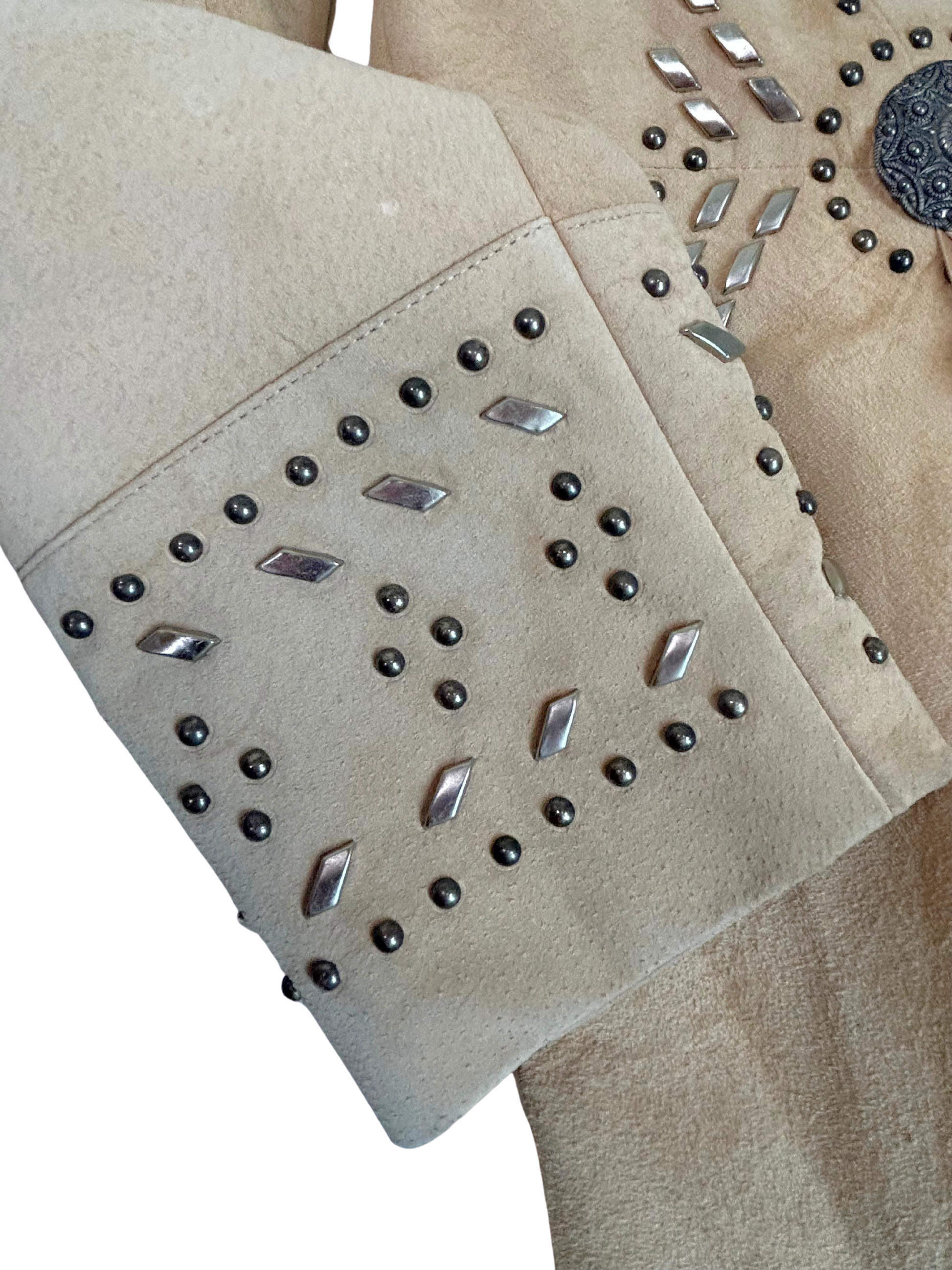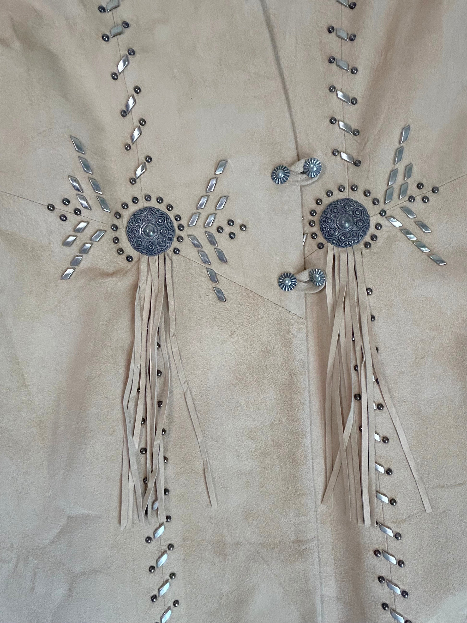 Amazing vintage Renegade Spirit duster coat, made in the USA and bursting with bold Western flair. Crafted from soft tan suede, this longline jacket features intricate studwork, statement faux conchos with fringe accents, and a classic tailored silhouette. Decorative stitching and diamond-shaped metal studs create an eye-catching design down the front, sleeves, and back, while the double concho button closure adds a rustic, rodeo-ready finish. Ideal for Western wear collectors, music festivals, or dramatic everyday styling.