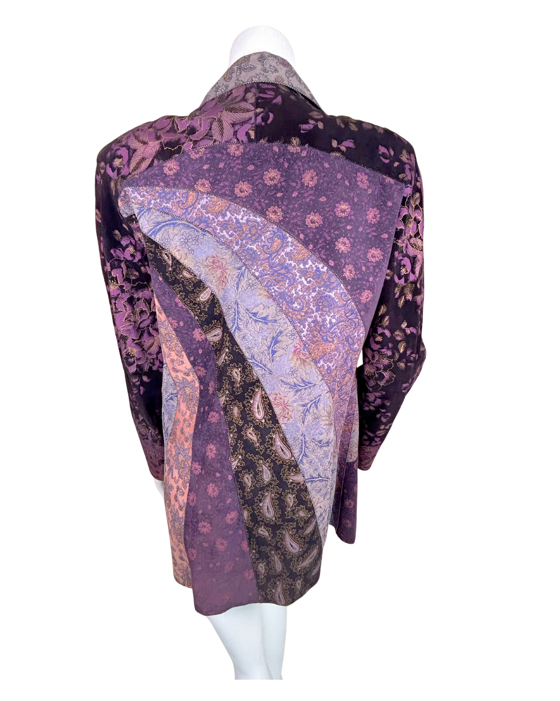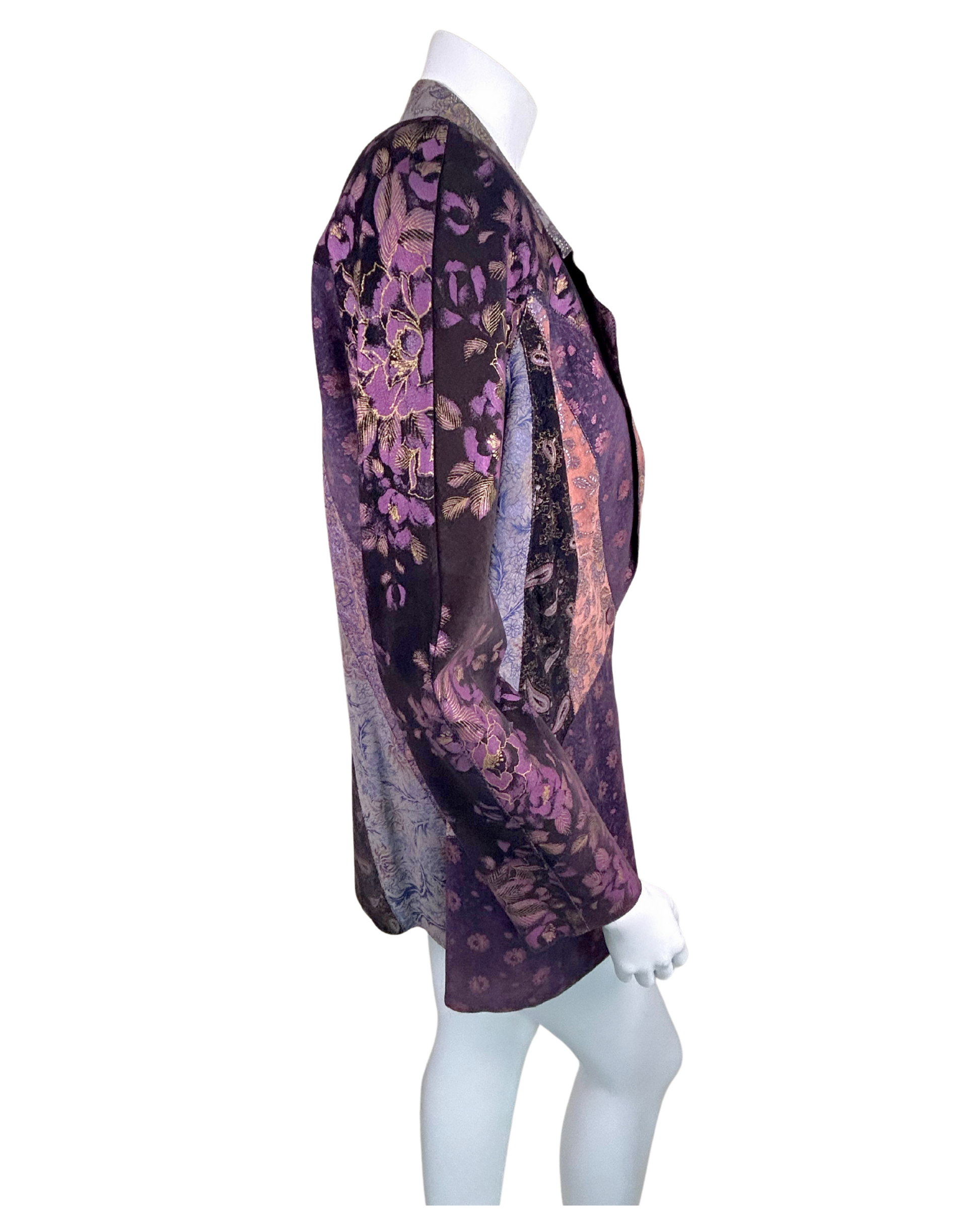 This rare vintage Roberto Cavalli jacket is a bold expression of the designer’s signature maximalism. Made in Italy in the late 1990s to early 2000s, the jacket features genuine printed leather intricately patchworked into a dramatic collage of baroque florals, paisleys, and jacquards in rich jewel tones—plum, amethyst, rose gold, and black. The sharp notched lapel and tailored fit emphasize the architectural silhouette, while the artisanal seaming and contrast stitching enhance its one-of-a-kind craftsmanship.