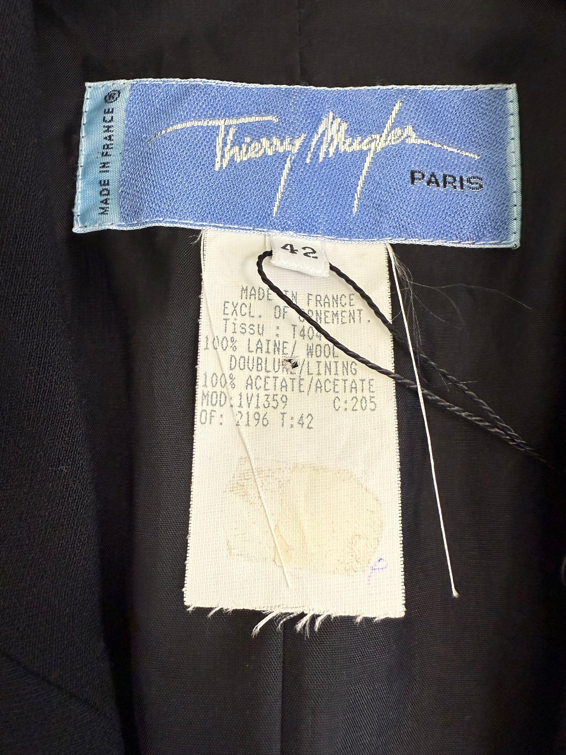 From Thierry Mugler’s iconic Fall/Winter 1988 runway collection, this vintage black wool blazer is a masterclass in the designer’s signature sculptural tailoring and glamorous precision. Crafted in France from 100% wool with a full acetate lining, the jacket features a sharply cinched waist, exaggerated pagoda shoulders, and a deep V-neckline framed by a dramatic notched lapel.