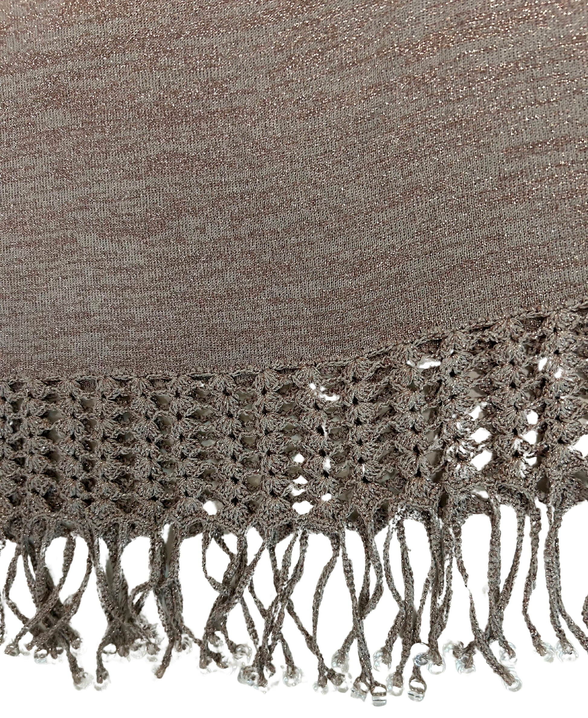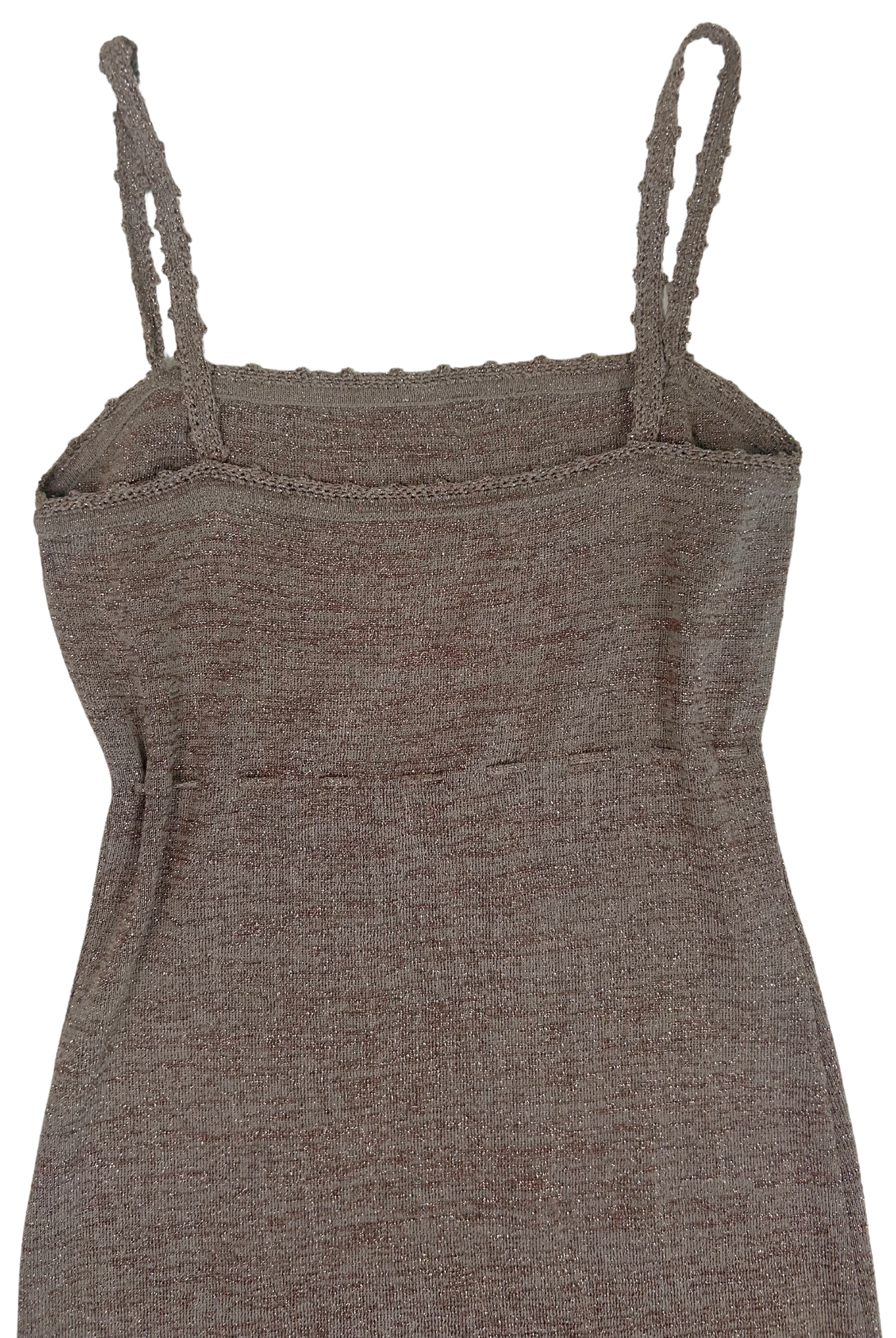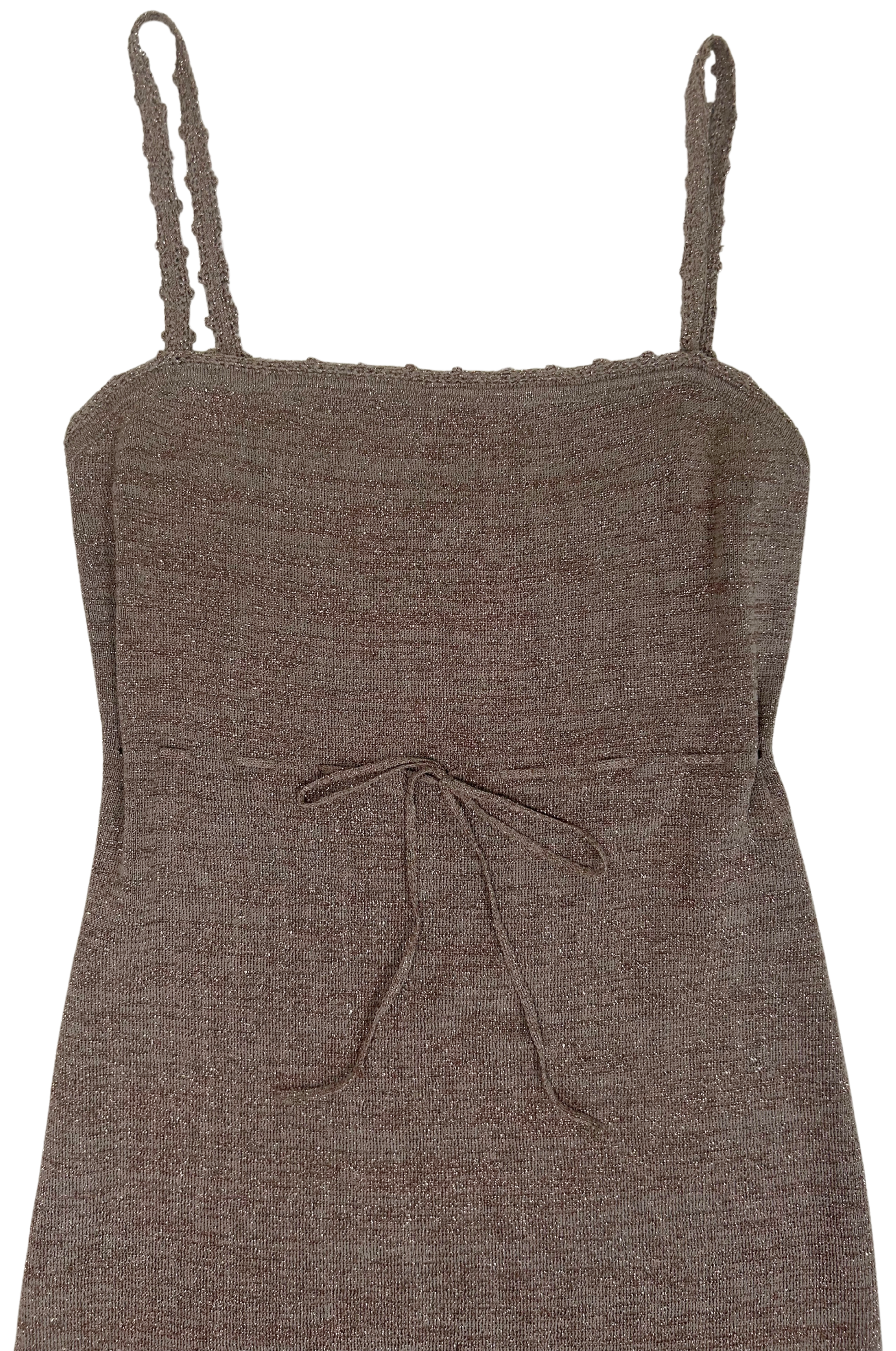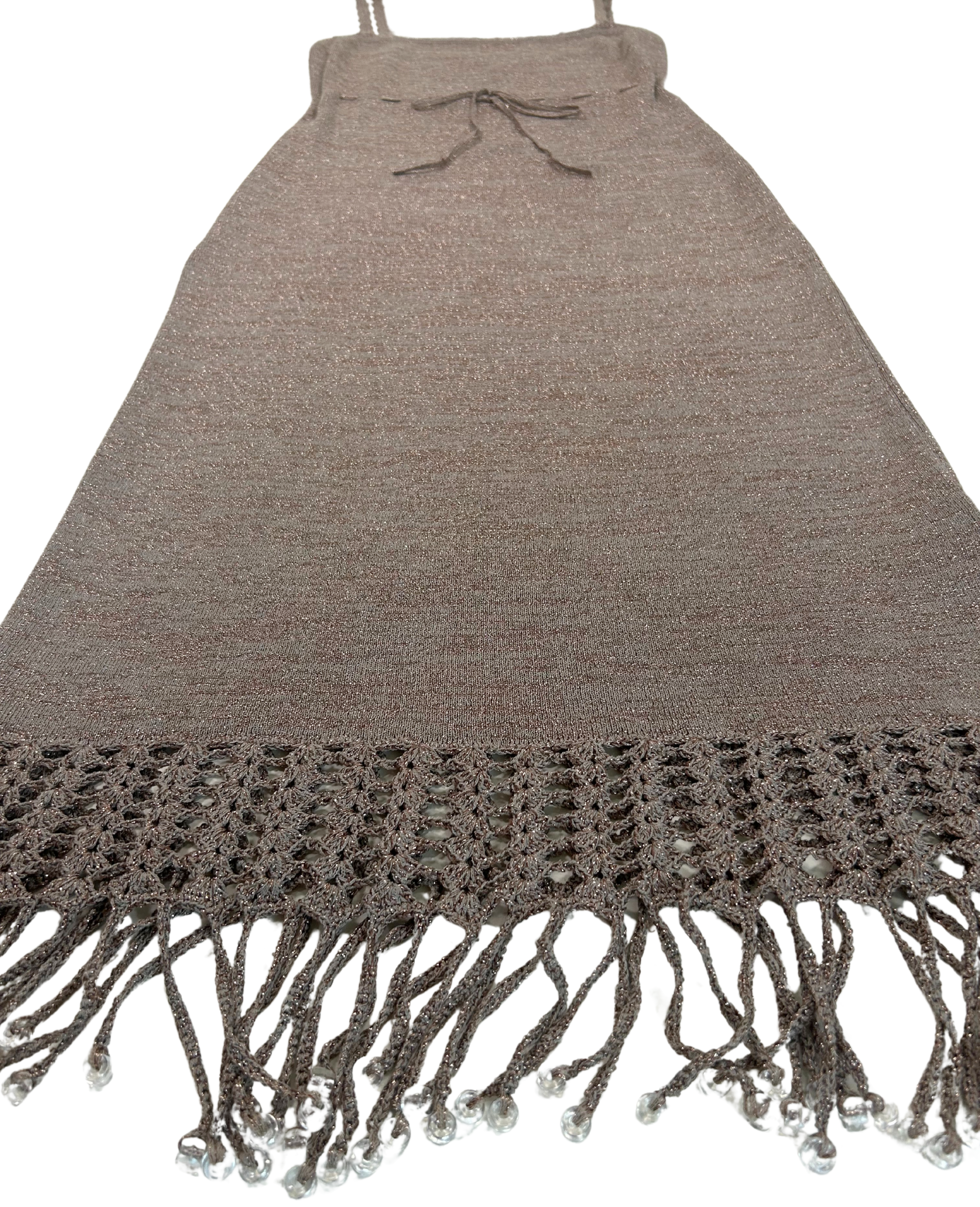 Vintage Y2K Katherine Woman Knitwear metallic knit dress. Crafted from a soft blend of polyester and viscose, this form-fitting midi dress features a subtly shimmering taupe-brown hue with a fine metallic thread woven throughout. The piece is delicately detailed with crocheted double straps, hand-tied macramé fringe hem adorned with clear beads and a woven tie threaded through the bodice which cinches the waist and finishes in a bow at the front for a flattering, adjustable fit. This piece offers an effortlessly bohemian-glam look, ideal for resort evenings, summer parties, or layered styling.