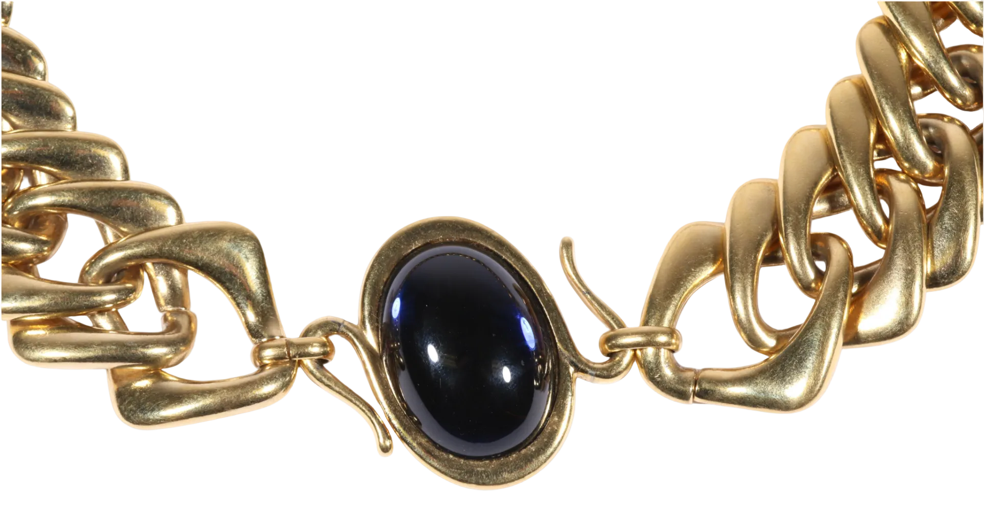 A bold and collectible vintage Yves Saint Laurent statement collar necklace designed in collaboration with legendary jewelry artisan Robert Goossens. This striking piece features a substantial gold-tone chain link construction centered by a rich dark navy blue jelly cabochon, bezel-set for a sculptural, high-impact finish.
